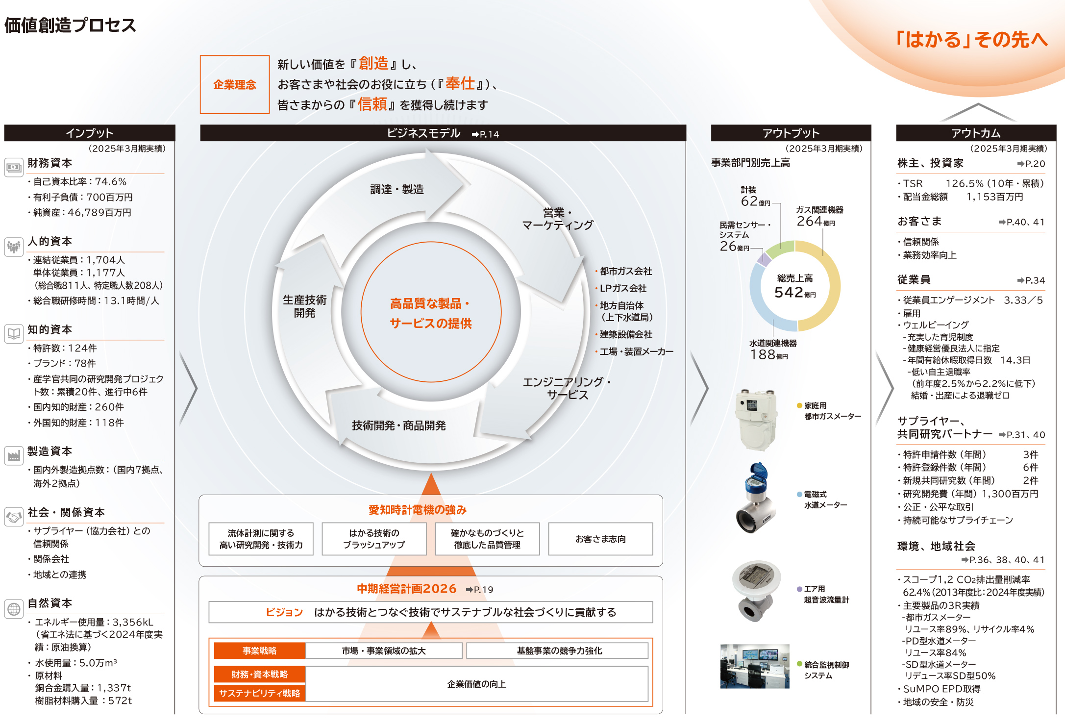 愛知時計電機では、「はかる技術とつなぐ技術でサステナブルな社会づくりに貢献する」をビジョンとして、流体計測に関する研究開発・技術力、はかる技術のブラッシュアップなどに努めています。それらの強みを活用し、省エネルギーをはじめとした社会課題の解決に貢献するため、基盤事業の競争力強化とともに事業分野の拡大にも挑戦しています。