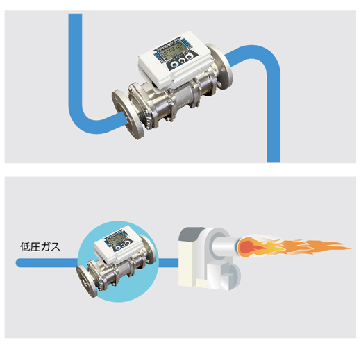 流量計の前後に直管部が不要なため、エルボなどの曲がり管や フレキシブル管に直結でき、配管の省スペース化が実現可能です。